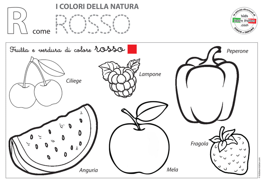 A4 coloring worksheet: Frutta e verdure di colore ROSSO