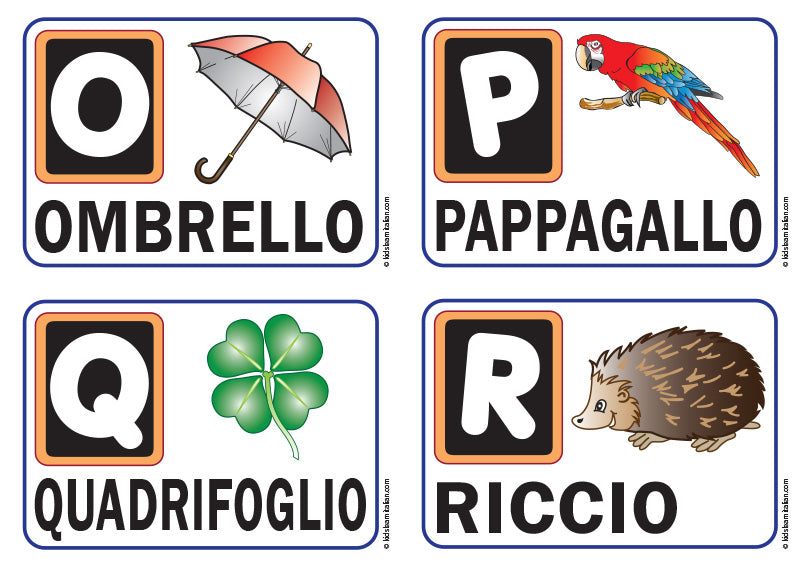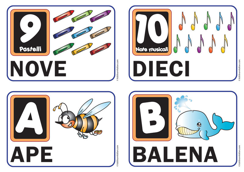 These flashcards, provided as downloadable pdf files, are an excellent visual resource for teaching children basic Italian numbers and letters.